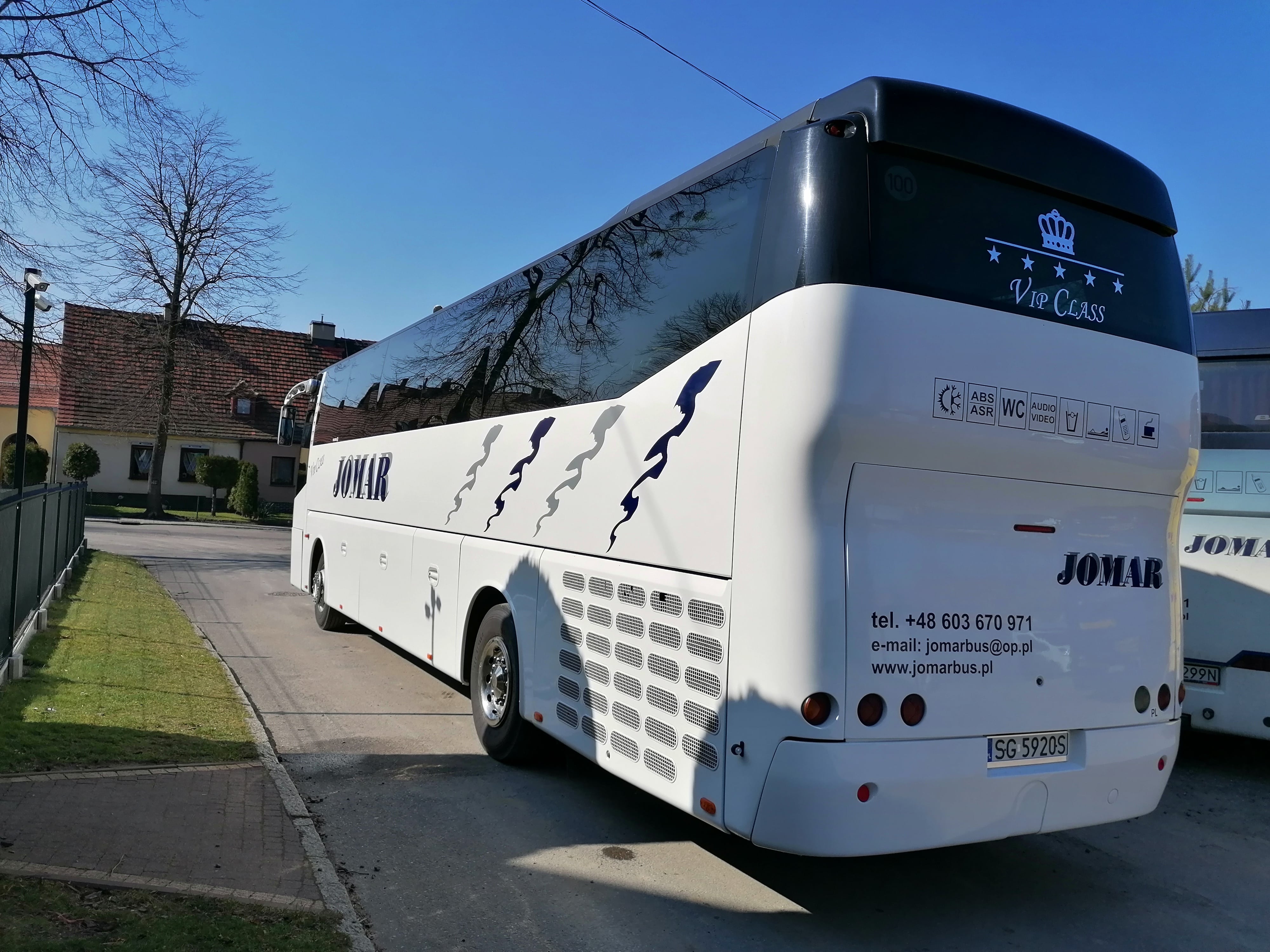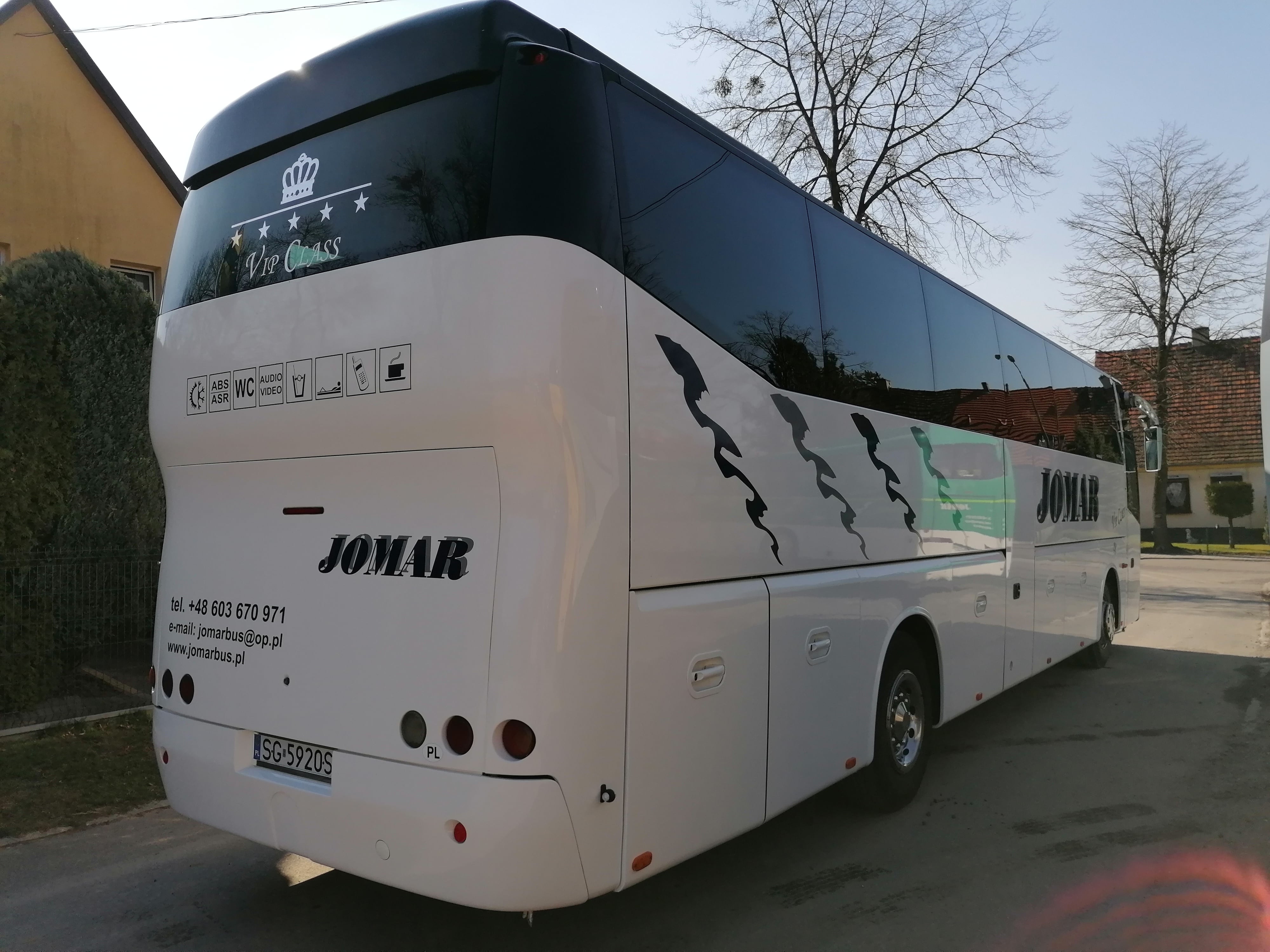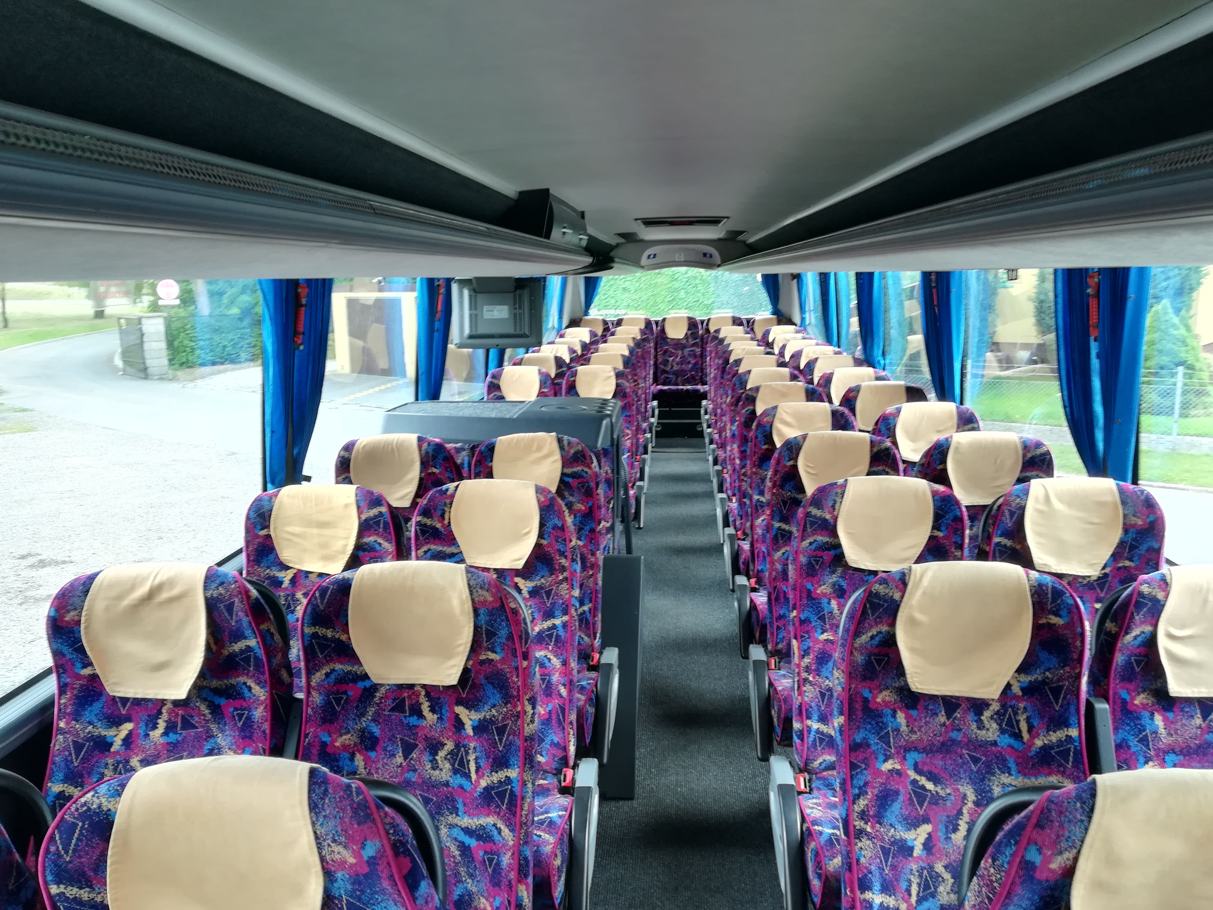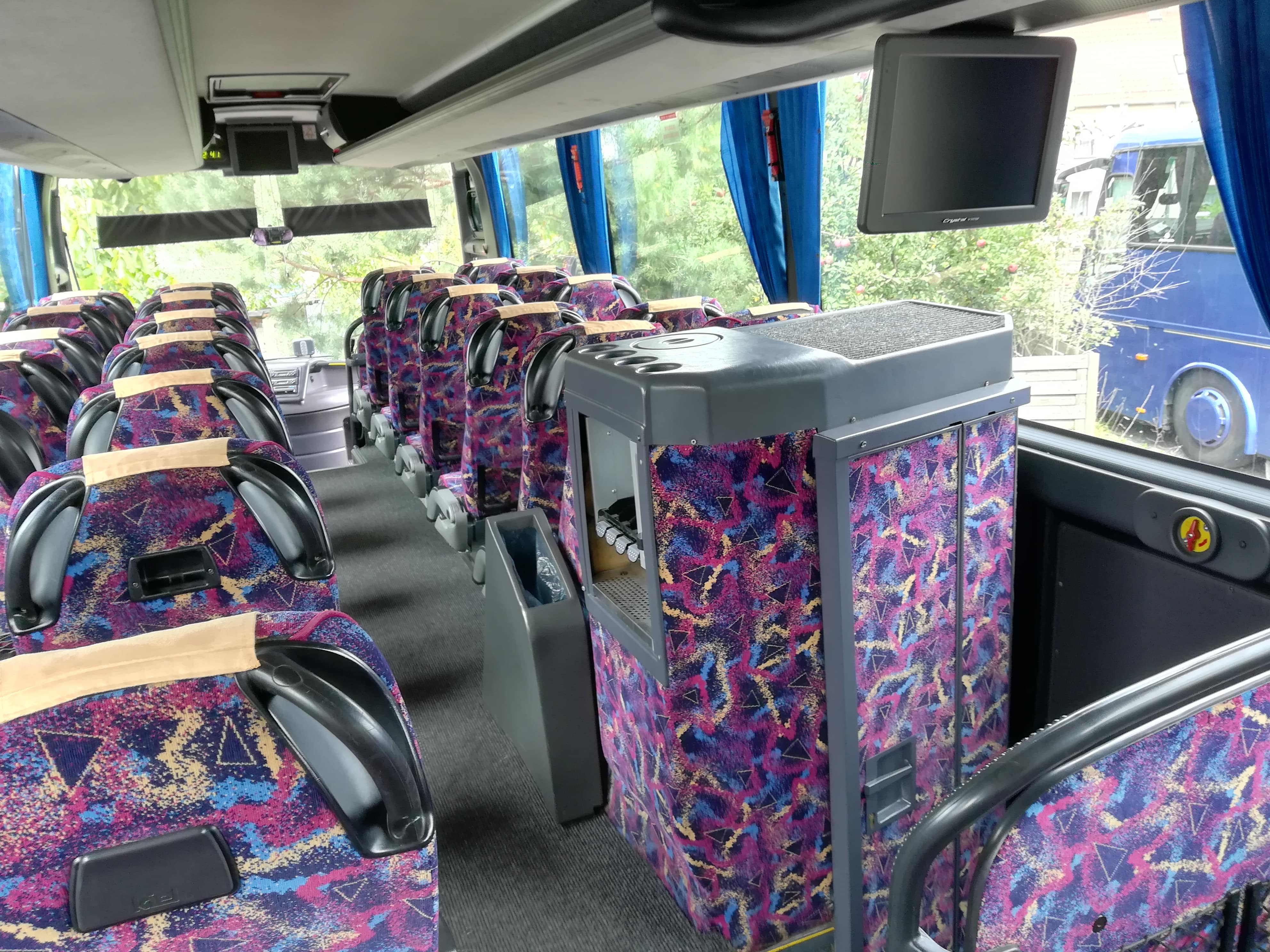 Wyposażenie: Nagłośnienie, mikorofon, TV, WC, cafebar, lodówka, klimatyzacja, rozsuwane fotele, pasy bezpieczeństwa na każdym fotelu.