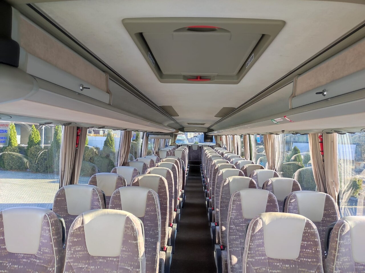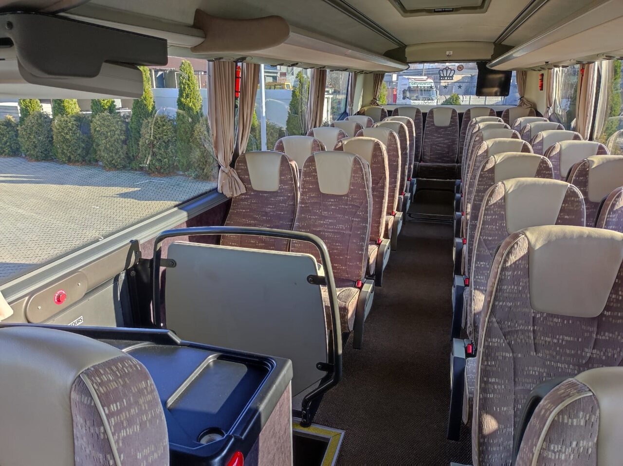 Wyposażenie: Nagłośnienie, mikorofon, TV, WC, cafebar, lodówka, klimatyzacja, rozsuwane fotele, pasy bezpieczeństwa na każdym fotelu.